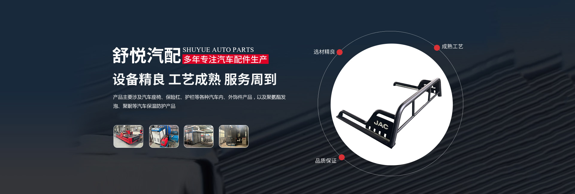 揚州舒悅汽配有限公司經(jīng)過多年的穩(wěn)定發(fā)展,業(yè)績一直蒸蒸日上。公司產(chǎn)品主要涉及汽車座椅、保險杠、護欄等各種汽車內、外飾件產(chǎn)品,以及聚氨酯發(fā)泡、聚脲等汽車保溫防護產(chǎn)品。其主要是為江淮、金龍,奇瑞等公司服務,已連續(xù)多年成為江淮、金龍等公司的A級供應商。        公司成立于1997年,現(xiàn)坐落于揚州市儀征劉集盤古工業(yè)集中區(qū)202號,公司占地面積26640平 方米,廠房建筑面積18512平方米。公司擁有先進的制造設備、可靠的生產(chǎn)工藝、完善的檢測手段和科學的管理,在售前和售后服務中做到快速反應,應急應變,為客戶提供優(yōu)良產(chǎn)品和滿意服務。公司的產(chǎn)品開發(fā)能力和生產(chǎn)規(guī)模在同行業(yè)中處于前列的地位。        揚州舒悅人秉承“誠信雙嬴”的原則,發(fā)揚“誠信、務實、創(chuàng)新、貢獻”的企業(yè)精神,恪守“顧客至上”的經(jīng)營宗旨,致精從業(yè),不斷引進新技術、新材料。以優(yōu)良的產(chǎn)品、合理的價格和周到的服務參與市場競爭。公司愿與國內外朋友建立真誠的合作伙伴關系,攜手共創(chuàng)輝煌!